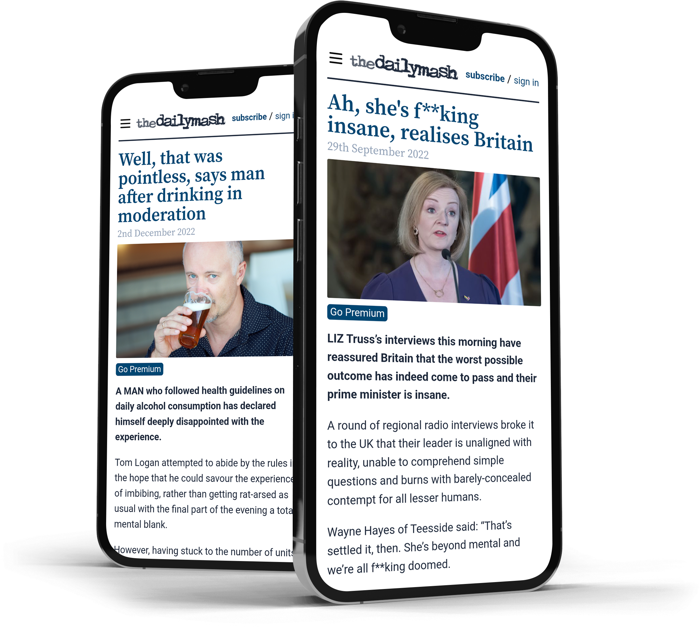 The Daily Mash is the UK’s leading satirical website. Established in 2007, it quickly established a loyal readership thanks to its unique take on news, politics, sport, arts & entertainment, lifestyle issues and more. 80% of the brand’s 25-44 year-old audience live in the UK with a roughly even male/female split. Readers can subscribe to Mash Premium for an ad-free experience with exclusive subscriber content.